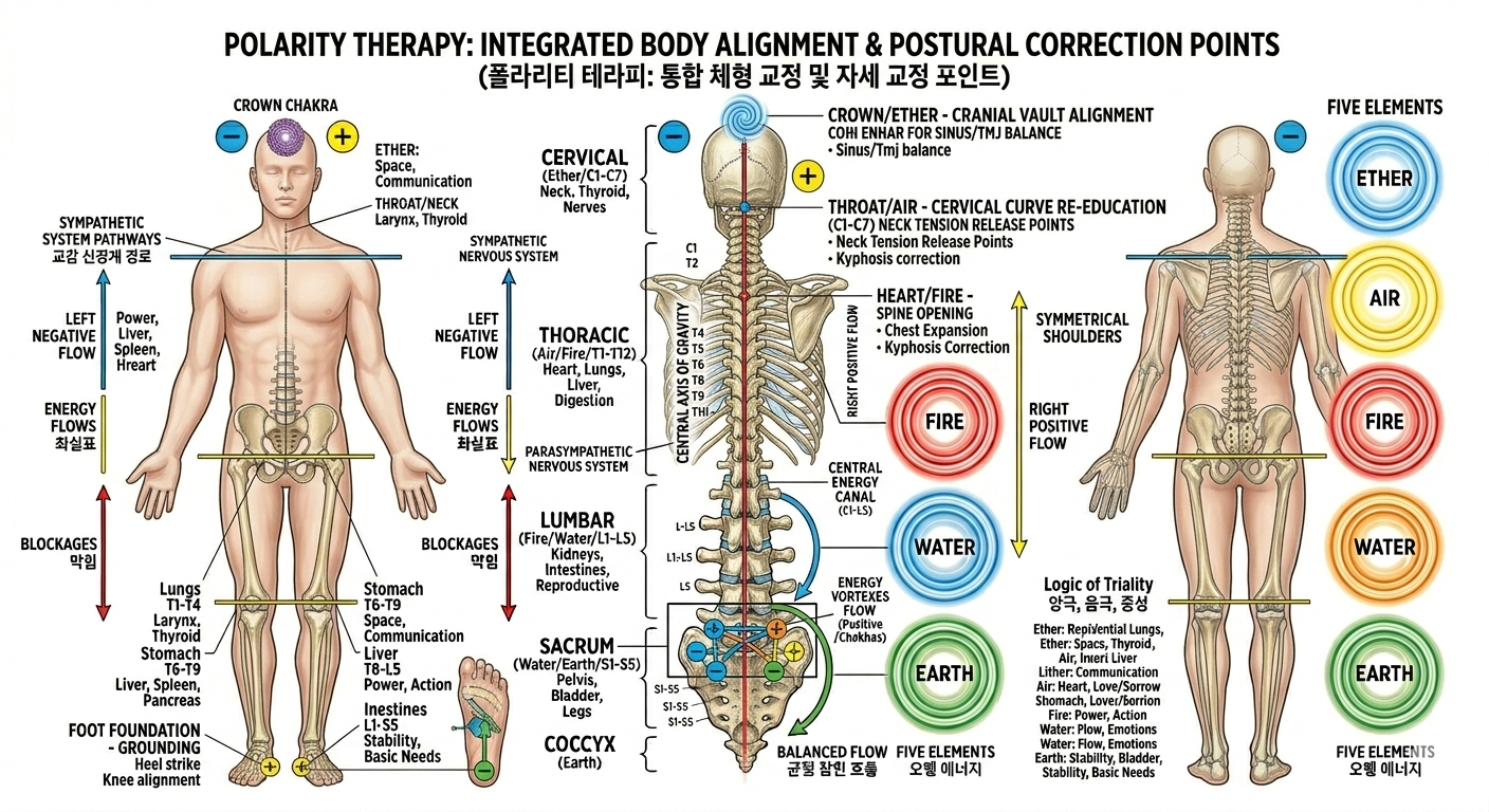 중성(Neutral Pole): 척추와 신체의 중심선. 양극과 음극 사이에서 에너지를 조절하고 통합하는 역할을 합니다.